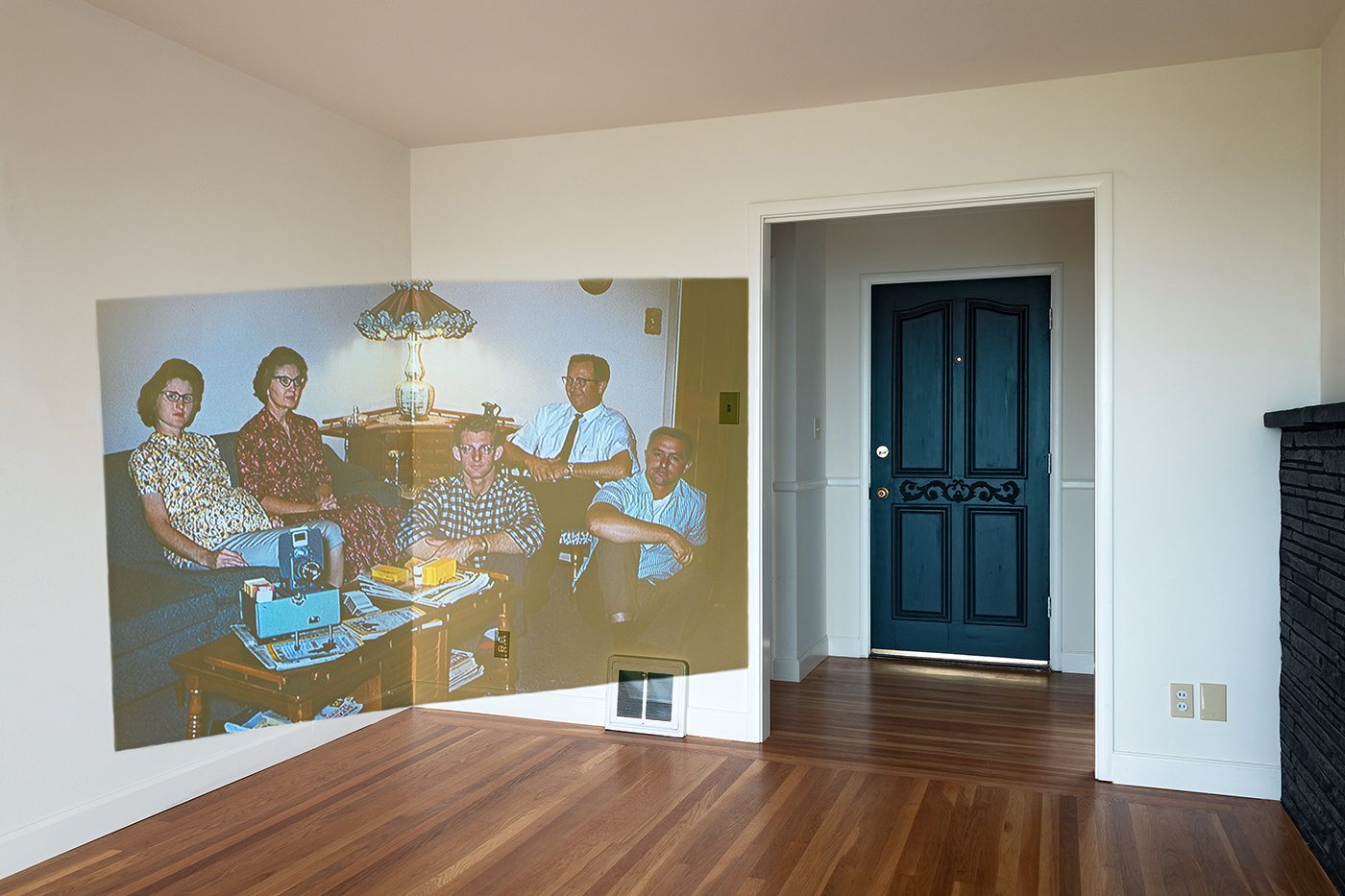 projecting family photographs onto the walls of her childhood home. Her layered compositions